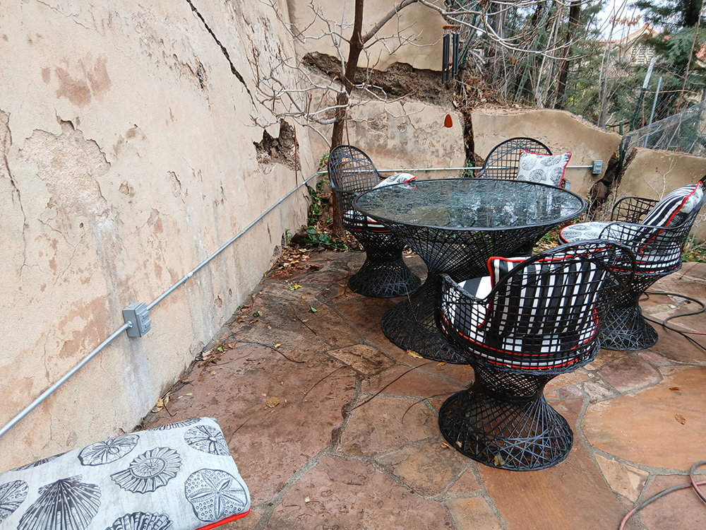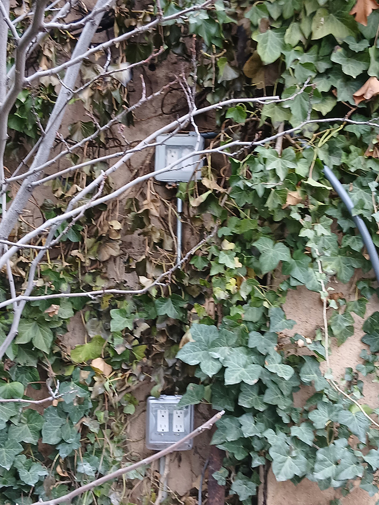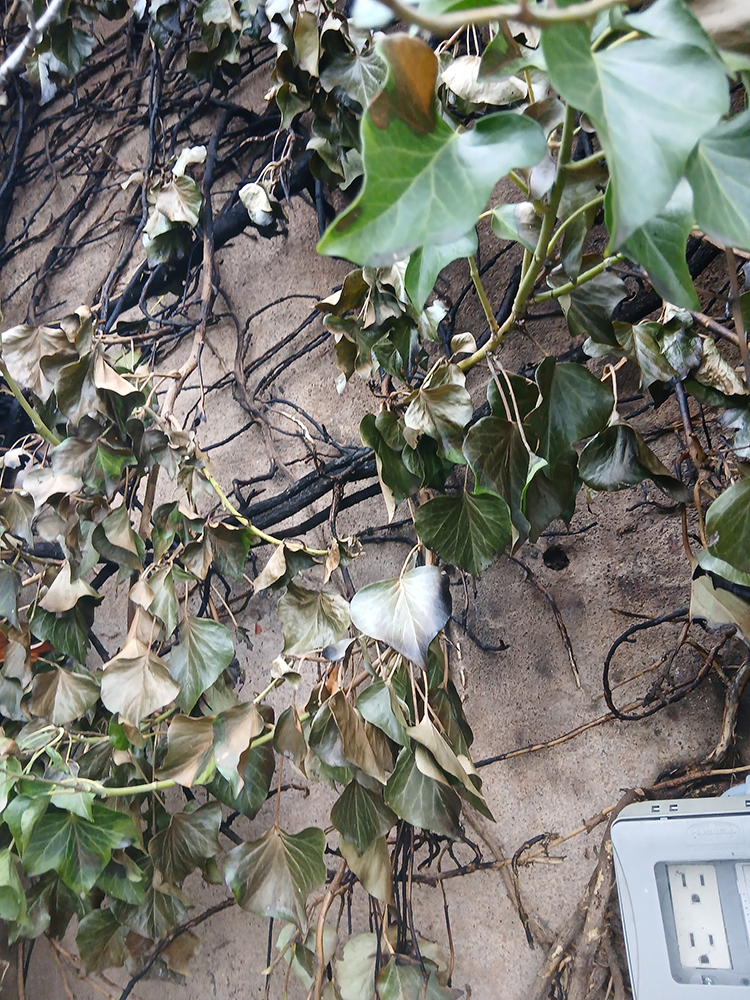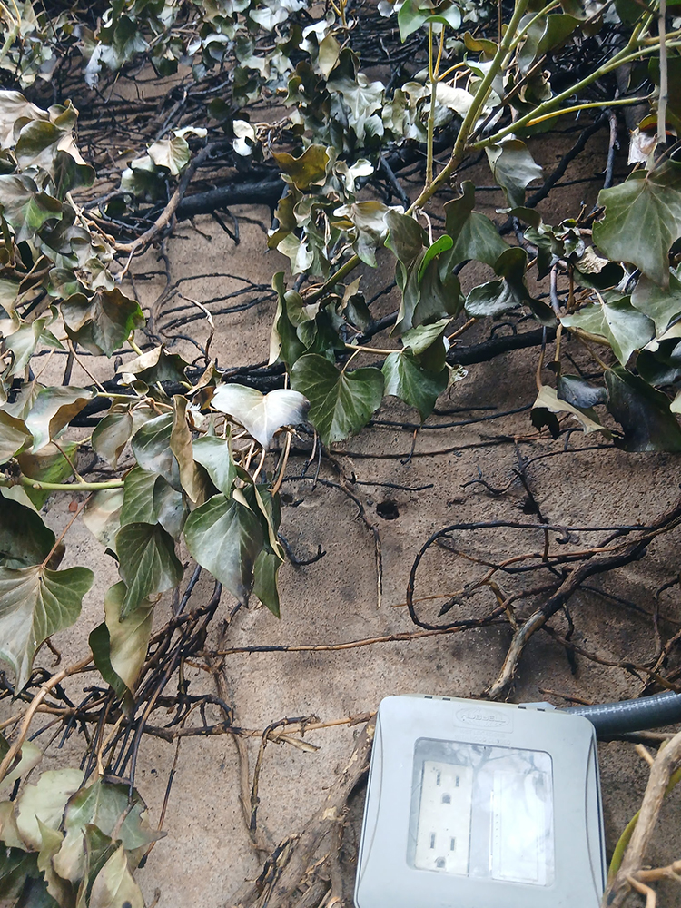 Recently our angels were really looking out for us in the Reunited Resurrected garden when we were alerted to smoke streaming out of the back retaining wall ivy – yipes! The Jerome Fire Dept arrived in a flash and although there were no flames the smoke was significant. They quickly ascertained that packrats had chewed through an outside extension cord and on top of everything, the GFI failed to trip – another bigger yipes. These guys continue to amaze our small community members with their responsiveness, expertise and human caring. The situation could have been far more serious but it surely got our attention so action needed to be taken sooner rather than later. Here is what the wall, the burned English ivy and the GFI looks like as a result of the packrat’s mischief.