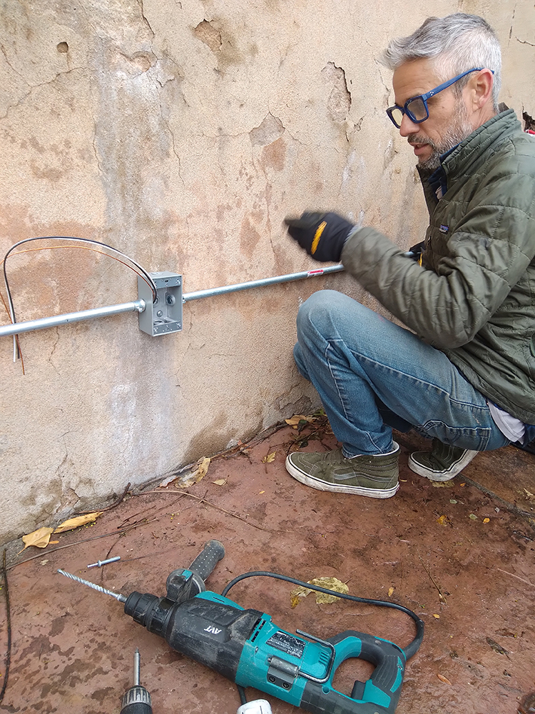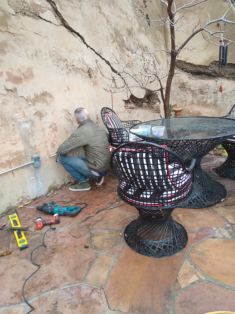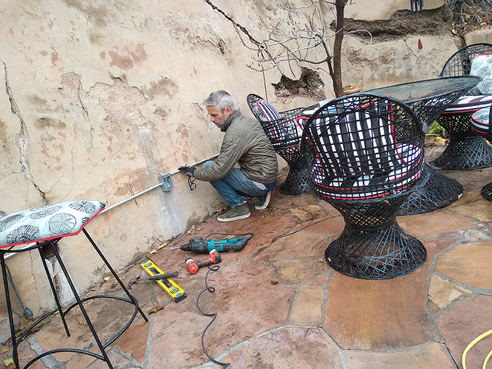 Braving a couple of cold and drizzly days, Joshua remedied the situation with surface-mounted electric extending across the back and side walls, replaced two failed GFI’s, and took the opportunity to install 3 new receptacles. All work was done up-to-code, of course, but we are going to take the next best safety step to invite Barry, the Jerome building inspector, to give us the A-OK with a walk-through. Safety first for our guests and of course for this grand home and property – whew . . .
