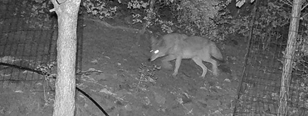 While we have observed many critters and a couple of coyotes over the years, and frequently we see skunks and racoons buddying up, this last sighting qualifies as an unmitigated FIRST. It appears that our coyote friend was not granted a warm reception.