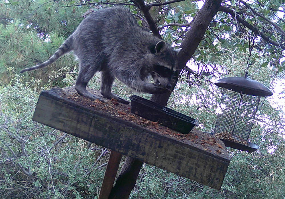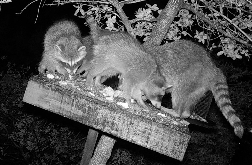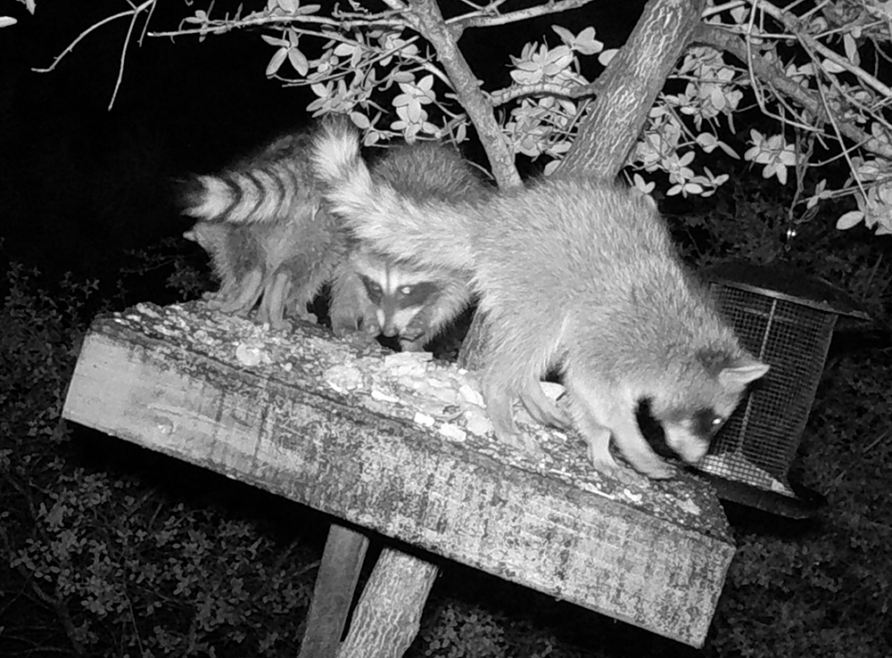 We have been scratching our heads to account for not having seen any raccoon-ettes (babies) then lo and behold here came mama with her entourage! The three babes all looking extremely healthy . . . yippee, yay and yowza.