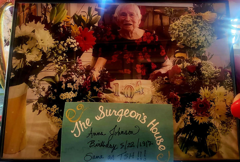 Today, 5/22/2025, is a day of great celebration and recognition of two of the world’s most memorable, classy, and graceful ladies – Miss Anna Johnson and us, The Surgeon’s House! We share the birthday of 5/22/1917 as we honour 108 years on the planet. Several years ago, beloved guests, Roabie and Jerry Johnson of Flagstaff, were good enough to ‘share’ Jerry’s mother’s birthday with us since we don’t know exactly on what day construction of my home was completed. While Miss Anna is no longer with us, we remember her with heartfelt fondness and extreme gratitude to Jerry and Roabie for including my home with her in such auspicious company.