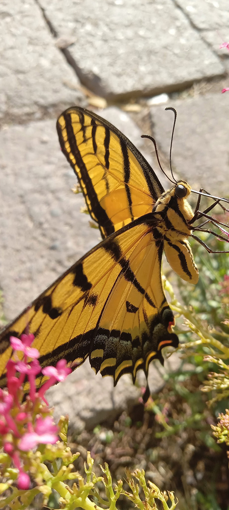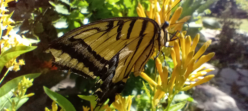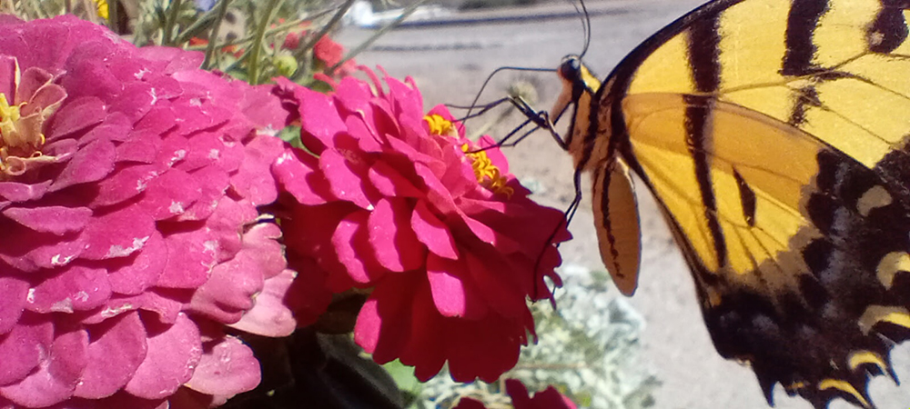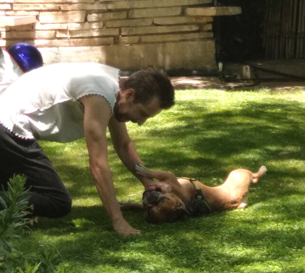 Everyone got into the act – the zinnias wooing the tiger swallowtails and the cool grass making it impossible for our neighbors Aaron and 4-legged Ru to resist.