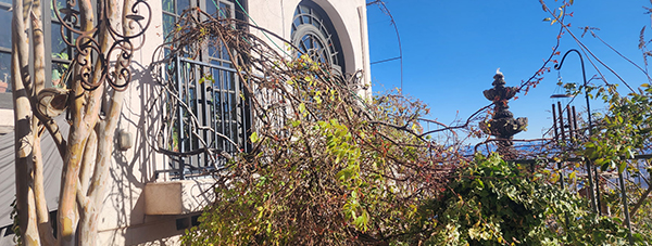 It was a welcomed shock that as far and hard as he fell, no main supporting (nor actually any of his) branches sustained breakage or other damage – praise Allah! Then, the task lobbed to the esteemed Mr. Ludwig to wrestle the beast back up the wall and re-secure it to the house. It is one massive bush and heavy as can be, so he employed two winches (come-alongs) strapped around the mid-to-base of Cecile using the chimney for leverage. He then trimmed the topknot (looks like Lyle Lovett’s hairdo) and tied the whole thing off to two anchors in the parapet wall at the rear of the Master Suite balcony. I add this detail for the sake of all future gardeners as once Cecile leafs out and re-establishes himself, those anchors will be nearly impossible to find.