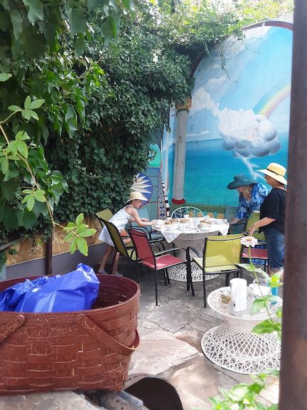 What could be better than a tea party, and HIGH TEA ta’boot complete with garden hats, English tea cozy and hand embroidered table linens, in the garden on a splendid summer afternoon? In Andrea’s nearly 28 years here, this is a FIRST but hopefully not the last. Miss Emily and her gram Bonnie hosted her entourage of family and friends who show us all how to do it right, eh? And a good time was enjoyed by all. . .you might want to hire her to organize one for you on your next visit.