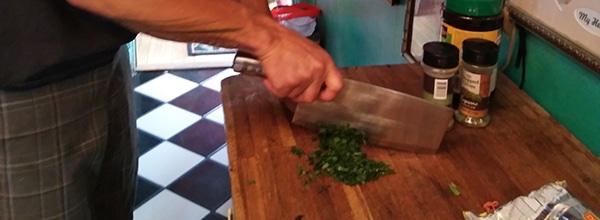 We conscripted our neighbor Allen to pitch in on the cutting and stuffing assault on the peppers while Joshua and I manned the other chopping and cooking tasks.