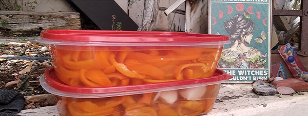 Animal, Vegetable, Mineral – blessings one and all. With a glut this week of the ALL-TIME SWEETEST yellow peppers on the planet, we jumped at the chance to use them in as many ways as we could imagine. We roasted for a confit extraordinaire, roasted with celery and onions for an indescribable yellow pepper bisque, and even made both sweet and dill pickled peppers with zucchini and onions – one skull & crossbones wicked heat batch for just a handful of demon heat-loving eaters.